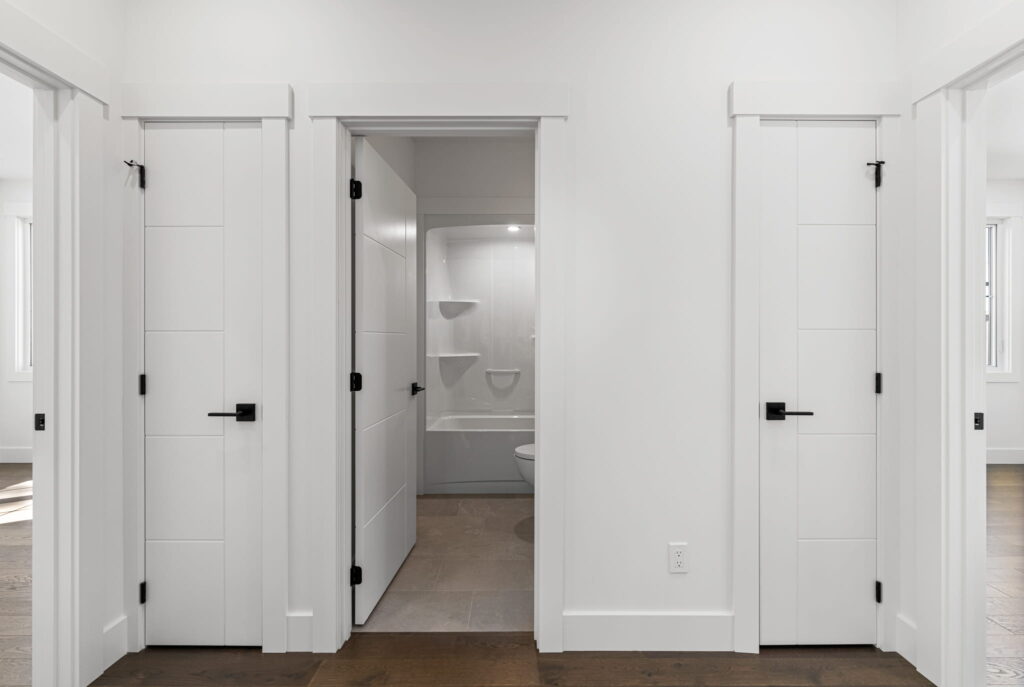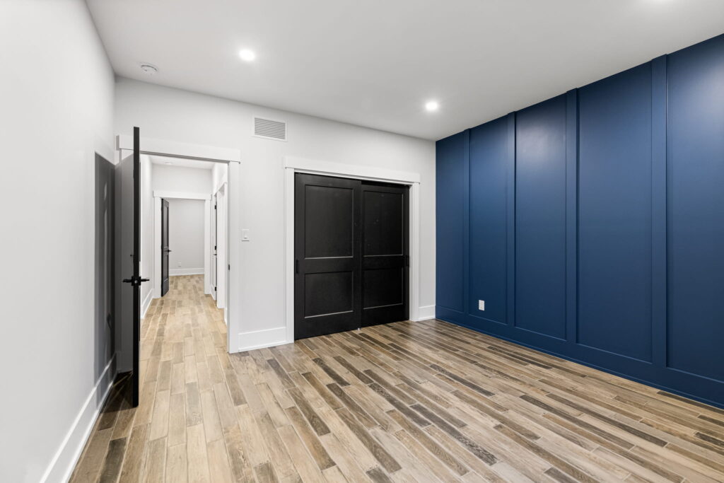 Precision interior finishing including baseboards, crown molding, door and window casings, feature walls, and detailed custom trim elements that complete your space with elegance.